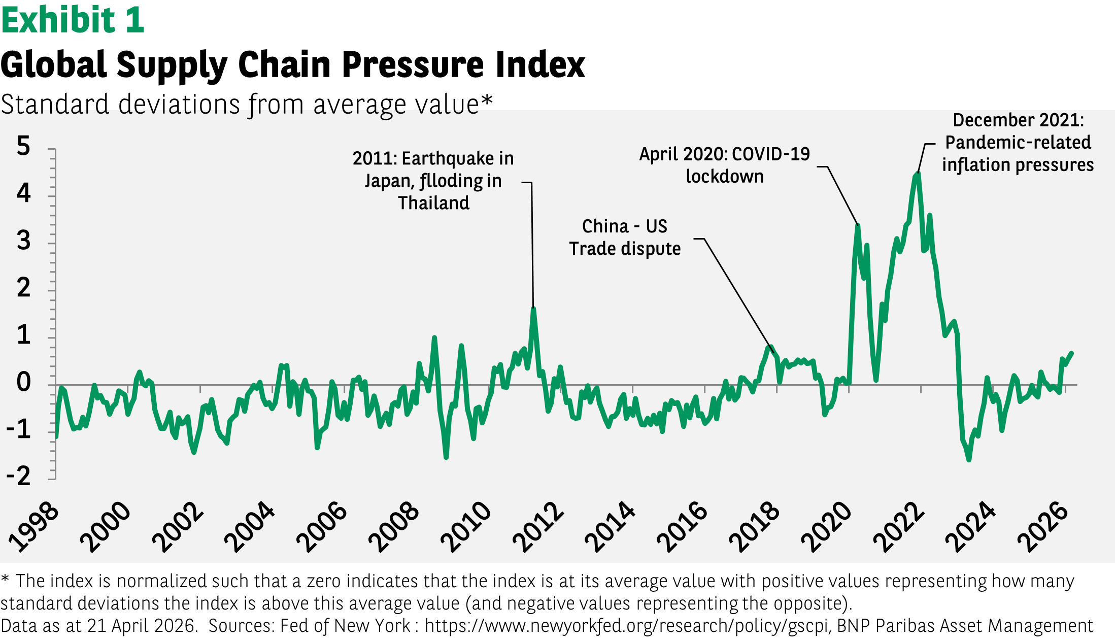 In 2022, the Federal Reserve Bank of New York created an index to gauge global supply chain conditions. It analyses transportation costs data (shipping and air freight) and subcomponents including delivery times, order backlogs and stockpiling information, taken from business activity surveys such as PMIs. Soaring oil prices amid the Middle East conflict, and accumulating inventories due to price and supply concerns drove the index up to 0.68 in March, its highest since January 2023. However, it remains far from the levels seen in 2021/2022 during the post-pandemic inflation surge. April’s data, released in early May, should further indicate whether these mounting pressures on global supply chains could start to threaten global growth.